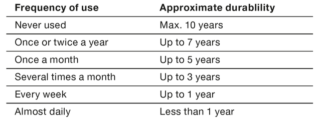 Wie lange eine Schlinge hält, hängt von Faktoren wie der Häufigkeit der Nutzung, der Handhabung und den Wetterbedingungen bei Gebrauch ab. Eine pauschale Nutzungsdauer lässt sich daher nur schwer bestimmen. Abbildung A bietet einen allgemeinen Anhaltspunkt dafür, wann du deine Schlinge ersetzen solltest. Auf jeden Fall solltest du sie regelmässig und sorgfältig auf Verschleisserscheinungen überprüfen, da sie hoher Belastung ausgesetzt ist.