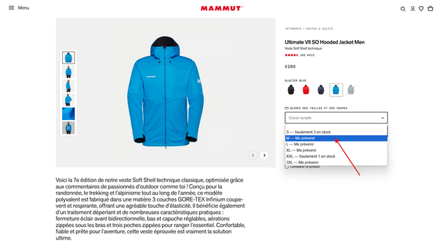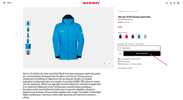 Entrez sur la page du produit qui vous intéresse. S’il n’est plus disponible dans votre taille, elle sera grisée et accompagnée d’une étiquette « Recevoir une notification ». Cliquez sur la taille qui vous intéresse et entrez votre adresse e-mail. Nous vous enverrons un e-mail quand votre taille sera à nouveau en stock.